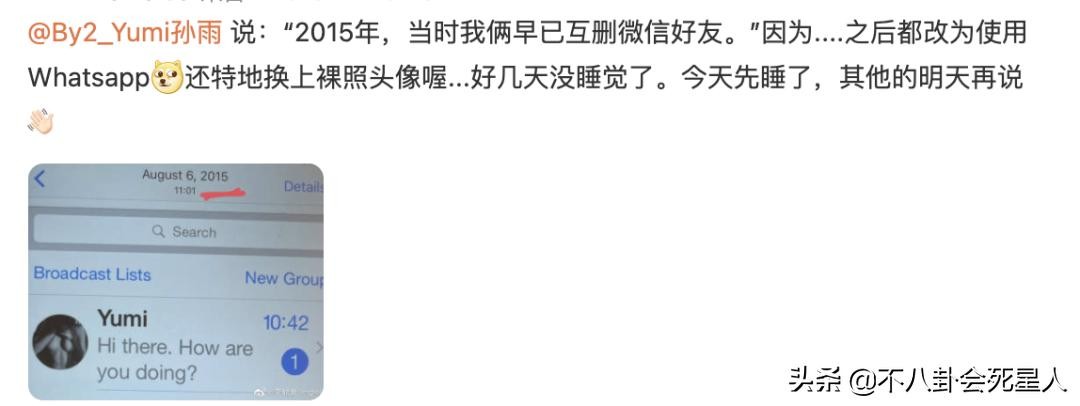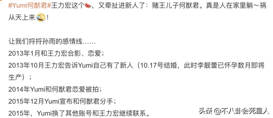 2014年孙雨和何猷君恋爱被拍,2015年12月孙雨宣布和何猷君分手,可2015年8月孙雨还换了其他账号,用大尺度头像当照片,和王力宏继续联系。