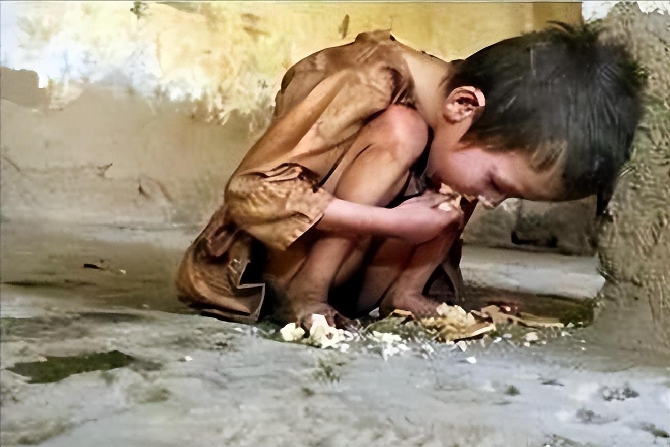 11、一个纤瘦的小孩子在墙角吃别人丢弃的馊面包。
