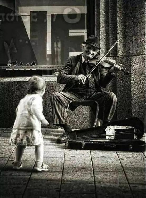17、流浪的老爷爷拉着小提琴,路过的小孩跟着音乐,欢快地跳起了舞。