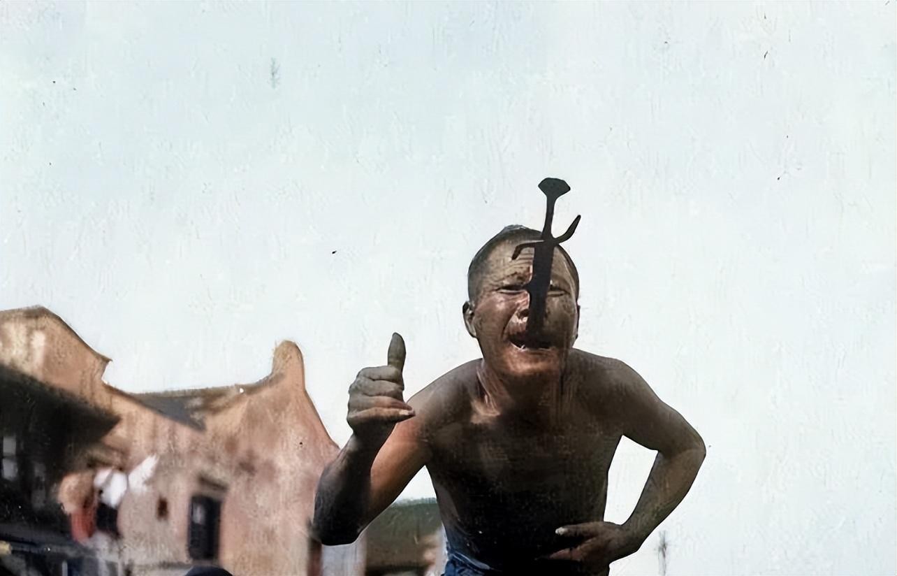 10、吞剑艺人在街头向人们展示自己的吞剑绝活来寻求打赏,