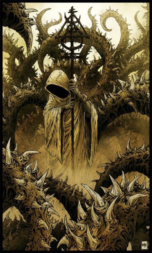 例如开篇洛夫克拉夫特的《克苏鲁的呼唤》里,克苏鲁是深陷在海洋深处的,而不是神圣的奥林匹斯山或是奇妙的仙境。其他文章里的“神明”也多是深藏在史前的洞穴里或是毫无描写的外太空里;其次,这些“神明”是没有操纵一切的力量的,而且是没有善恶之分的,或者说他们的善恶观是不同于人类的,就像我们走在路上踩死蚂蚁,在蚂蚁看来我们是恶的,但是人类的善恶观里这并不是恶。之所以这样说,是因为在多数的故事里,这些“神明”的出现都是由于人类的召唤,即使召唤招致死亡,也都是只波及少数人,被召唤出来的“神明”并没有大开杀戒;最后,就是这些“神明”的形象不再以人类自身为蓝本,皆为奇异的无法被准确描述的生物体。