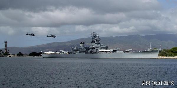 上图是停靠在夏威夷珍珠港港湾的密苏里号战列舰