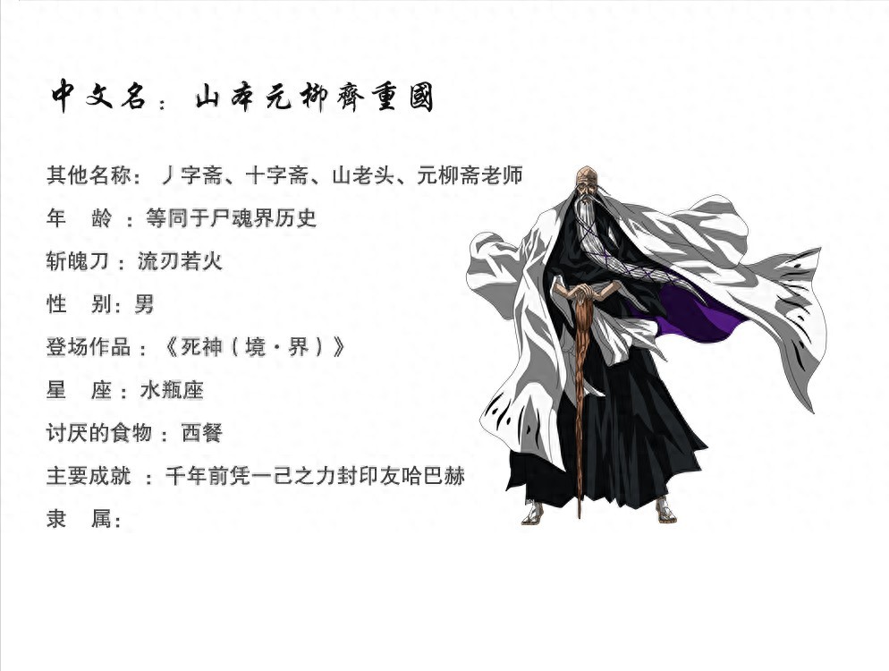 山本元柳斎重国“元流”开祖暨真央灵术院创始人。他号称是“尸魂界最强的死神”,也是护廷十三队的最高指挥官。
