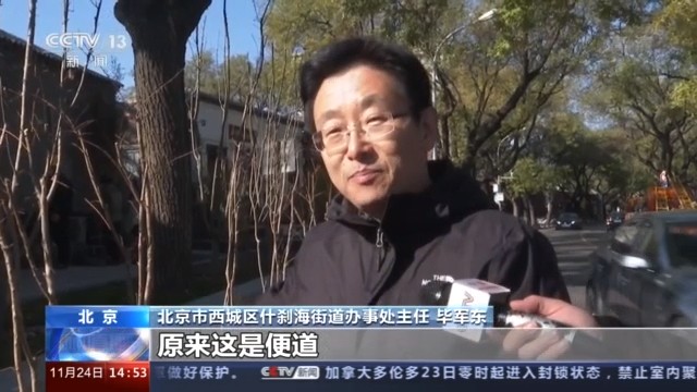 北京市西城区什刹海街道办事处主任 毕军东:原来这是便道,便道也就不到一米宽,另外这个便道也没有抬升起来。实际上这个当时两侧都停满了车,特别是车辆斜着停在这上头,很多老百姓就直接在主路上通行。在这次设计的过程中,老百姓从那边走过来,很顺畅地就能从这儿走过来,既安全,又能够通行便畅。