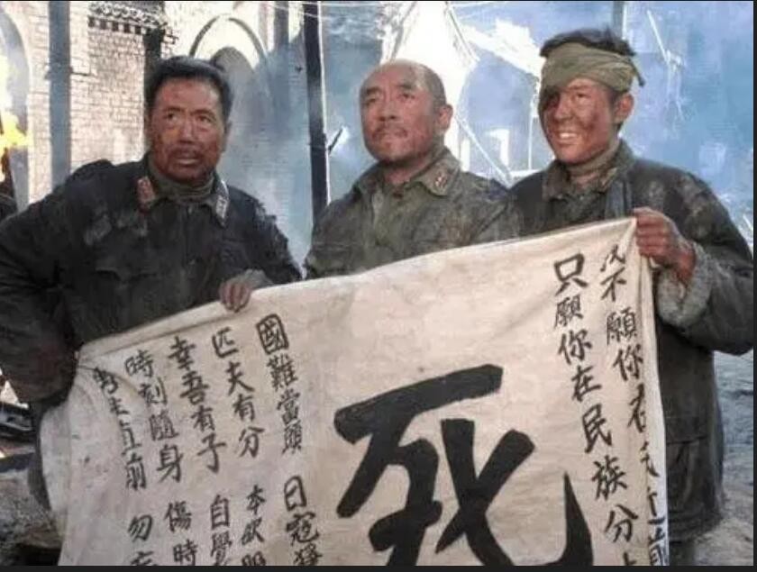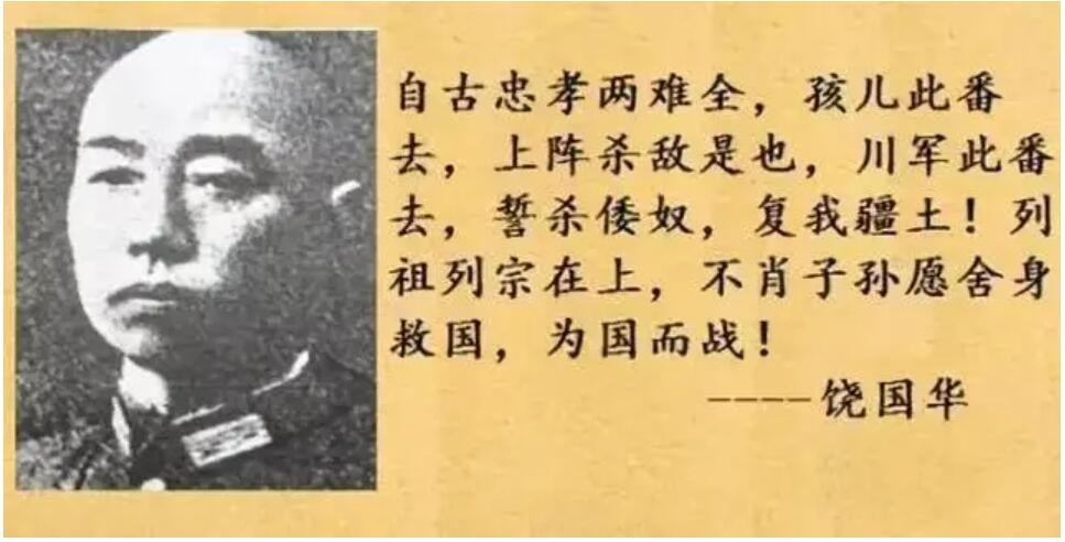 又如曾被誉为“模范父亲”的安县王者成,送其自动请缨出征的儿子王建堂时场景更催人泪下:他赠送给儿子的竟是一面“死”字旗!他在白布旗正中写了个大大的“死”字,旗子左方写道:“国难当头,日寇狰狞。国家兴亡,匹夫有分。本欲服役,奈过年龄。幸吾有子,自觉请缨。赐旗一面,时刻随身。伤时拭血,死后裹身。往勇直前,勿忘本分!”