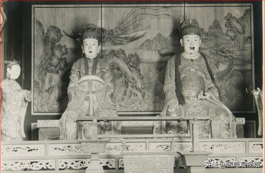 拍摄于1929年--辽宁 锦州 北镇 北镇庙 寝宫位于寺庙最深处,但这个寝宫并不是供人休息的地方,而是正式的居室,供奉有男女二柱的神明,在中国的宗教中,神明和人类一样需要生活,例如要供奉山的话就有山神这样人形化的存在,这样的宗教思想普遍存在。