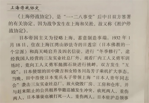 1932年1月28日午夜,日本海军第一遣外舰队司令盐泽幸一指挥海军陆战队突袭上海闸北。在蒋光鼐、蔡廷锴等将领的指挥下,中国第十九路军奋起抵抗,给日军以沉重的打击。在激烈的战斗中,日军对我军阵地及民宅、商店进行了狂轰滥炸,并发动了四次总攻,但均被中国军队击退。这场抗战在江湾、吴淞、曹家桥、浏河、八字桥一带展开,中国军队以巨大的勇气和牺牲精神捍卫了国家的尊严。