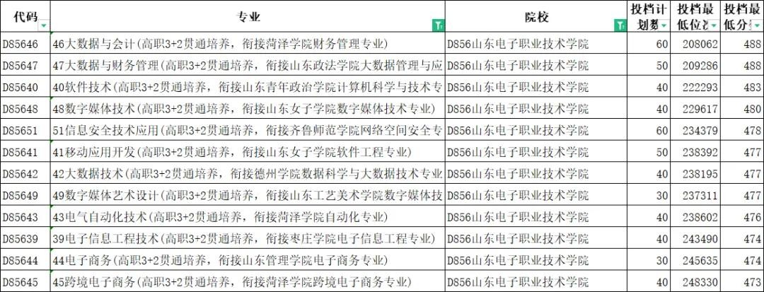 山东电子职业技术学院今年新增了10个3+2专本贯通专业,省内高职3+2专本贯通最高分500分,最低分473分,平均分482分,最低分超一段线29分。其中大数据与会计(高职3+2贯通培养,衔接菏泽学院财务管理专业)、大数据与财务管理(高职3+2贯通培养,衔接山东政法学院大数据管理与应用专业)等财会类新增3+2专本贯通专业热度居高不下,投档线488分,投档位次20万左右,超过一段线44分。