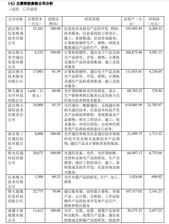 2021年度营业收入263.15亿元,同比增长24.87%;归属于上市公司股东的净利润2.88亿元,同比增长181.52%;归属于上市公司股东的扣除非经常性损益的净利润2.44亿元,同比增长295.87%;基本每股收益0.25元。通信系统设备销售收入170.86亿,较2020年(129.74亿)增长31.70%;光纤及线缆销售收入58.50亿,较2020年(52.40亿)增长11.63%;数据网络产品实现销售收入30.39亿,较2020年(25.22亿)增长20.50%。通信系统设备及线缆类产品占到总收入比重分别64.93%和22.23%主要参股公司情况