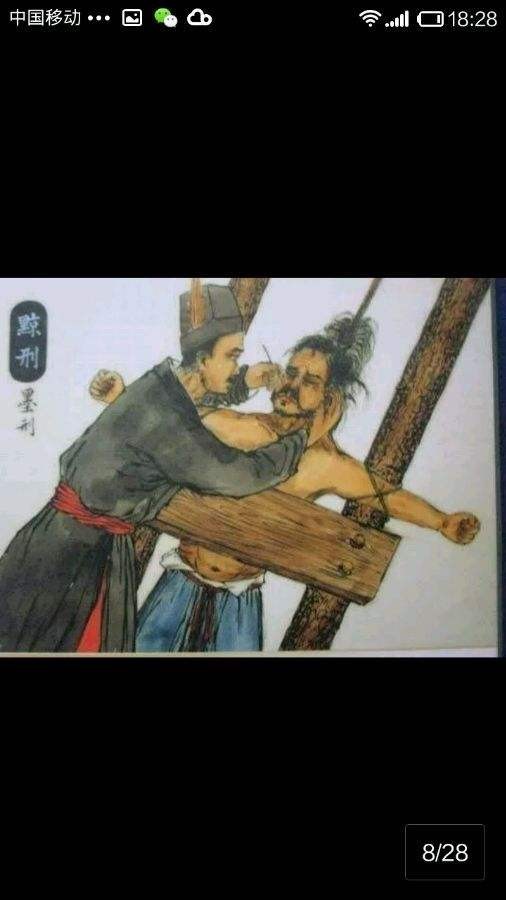 1. 墨刑。最开始是用墨涂抹犯人脸部,用以侮辱人格。后来发展成用尖刺在脸上刺字,和发配边疆配合使用,合称“刺配”。宋代时非常流行这种刑罚,试问梁山英雄,谁要是脸上没被刺字,没被发配苦寒之地,你都不好意思称“好汉”!