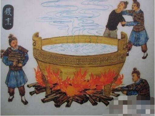 5. 炮烙。商纣王首创,“青铜柱,下加之碳,令有罪者行焉,辄堕碳中”,让受刑人赤脚走过烧红的铜柱上,最终掉落炭火而亡。另一种说法为:做一个巨大的铜碳盆,赤脚上去跳,最终烧死。