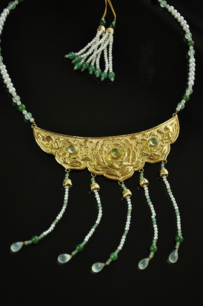 在古时候开掘的大型佛教云冈石窟中,我们能看到清晰的璎珞装饰。那时候的璎珞形制已有珠链和项圈两种。这种较为粗放的造型是与鲜卑等游牧民族的喜好有很大的关系。