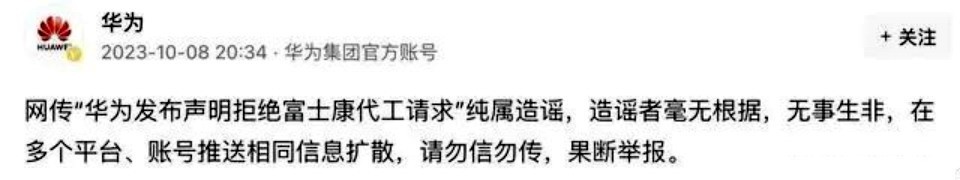 2023年10月8日:华为发布辟谣声明,