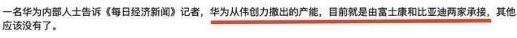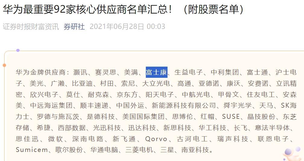 2021年6月:证券时报财富资讯发文《华为最重要92家核心供应商名单汇总!》,富士康位列华为金牌供应商之一。