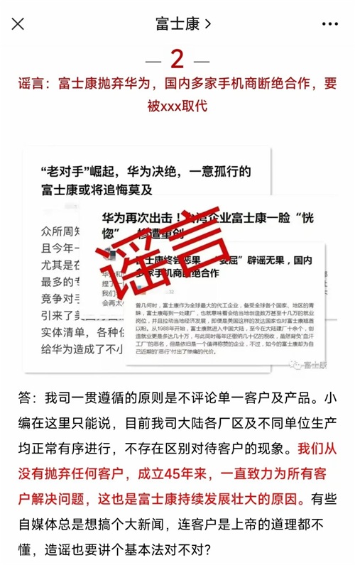 2019年6月26日晚:富士康官方微信曾发布文章针对“富士康抛弃华为,国内多家手机商断绝合作”相关谣言,富士康回应称,公司一贯遵循的原则是不评论单一客户及产品。富士康当时在微信文章中表示:“目前大陆各厂区及不同单位生产均正常有序进行,不存在区别对待客户的现象。我们从没有抛弃任何客户,成立45年来,一直致力为所有客户解决问题,这也是富士康持续发展壮大的原因。”