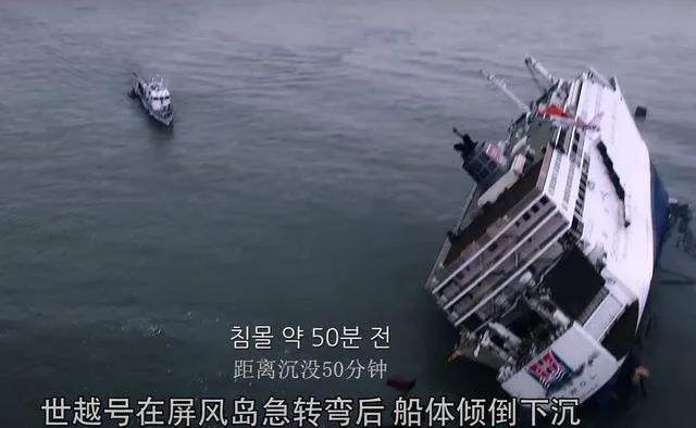 “世越号”行驶了一晚,第二天早上8.58分到达全罗南道珍岛海域,在船体进行转弯时,突然发生倾斜,船体迅速下沉,直至最后完全沉没海底。