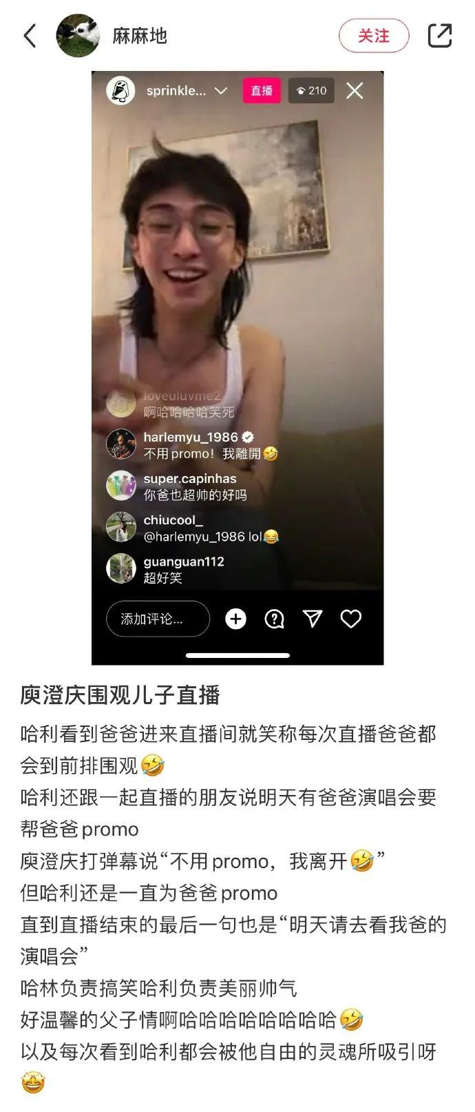 最近哈利一直在直播嘛,然后庾澄庆每次都是前几个蹲守在他直播间的观众。