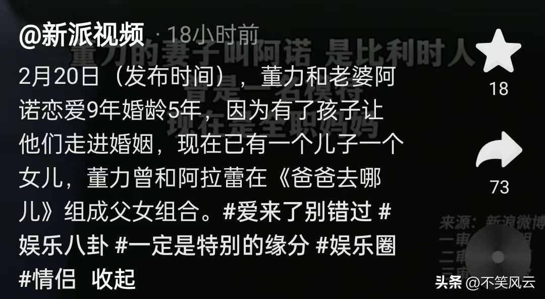[1]官方媒体:新派新闻2025--2-20《董力和老婆阿诺恋爱九年婚龄五年,因为有了孩子走进婚姻》