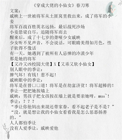 《穿成大佬的小仙女》女主古穿今,聋哑娇软美人,后期会恢复,男主前世将军,今生是不良少年,两个人互相治愈的校园小甜文。
