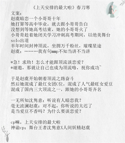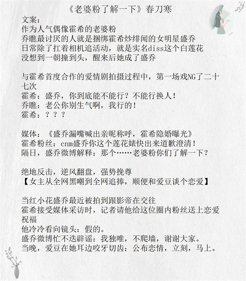 刚开始看到春刀寒,是在晋江的积分榜上,《老婆粉了解一下》当时应该长期占据半年或者季度积分榜第一,看文案真的是劝退我等不混饭圈老阿姨,毕竟穿越到其他人身上去追星,当粉丝时爱豆不可以恋爱,自己成了明星就追着和爱豆恋爱,这个设定,真的emmm,看了文整体风格还是很搞笑的,爽点和节奏都踩得不错,当然瑕疵是人物设定单薄,部分剧情及其沙雕。