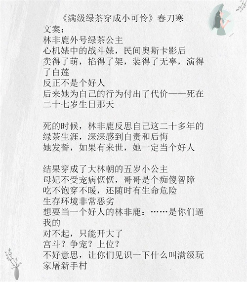 《满级绿茶穿成小可怜》被文名吸引进去看的文,文名是真不错,女主穿成小公主的茶言茶语的二三事,前面还不错,可看,到了后期有点崩坏,总体剧情虽行云流水也略显老套,期待的期待没有,文荒可看。