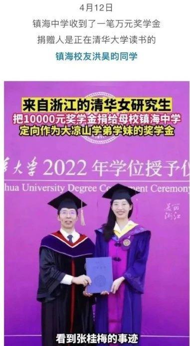 上个月,洪昊昀正在清华大学读研,刚刚申读博士成功,给母校镇海中学捐了一笔万元奖学金,定向捐给在镇海中学就读的四川大凉山 2025 级学生。