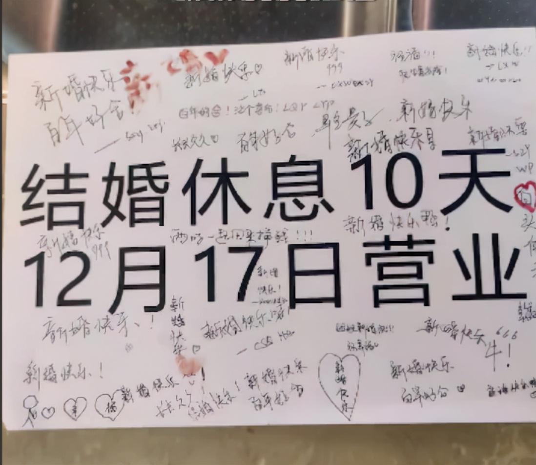 原因是食堂冷锅串串的老板12.7日贴出告示:结婚休息10天,12月17日营业。
