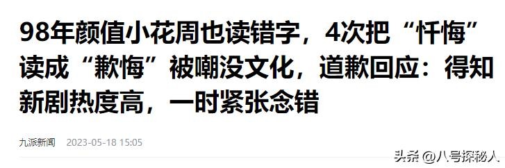 九派新闻——98年颜值小花周也读错字,4次把“忏悔”读成“歉悔”被嘲没文化,道歉回应:得知新剧热度高,一时紧张念错
