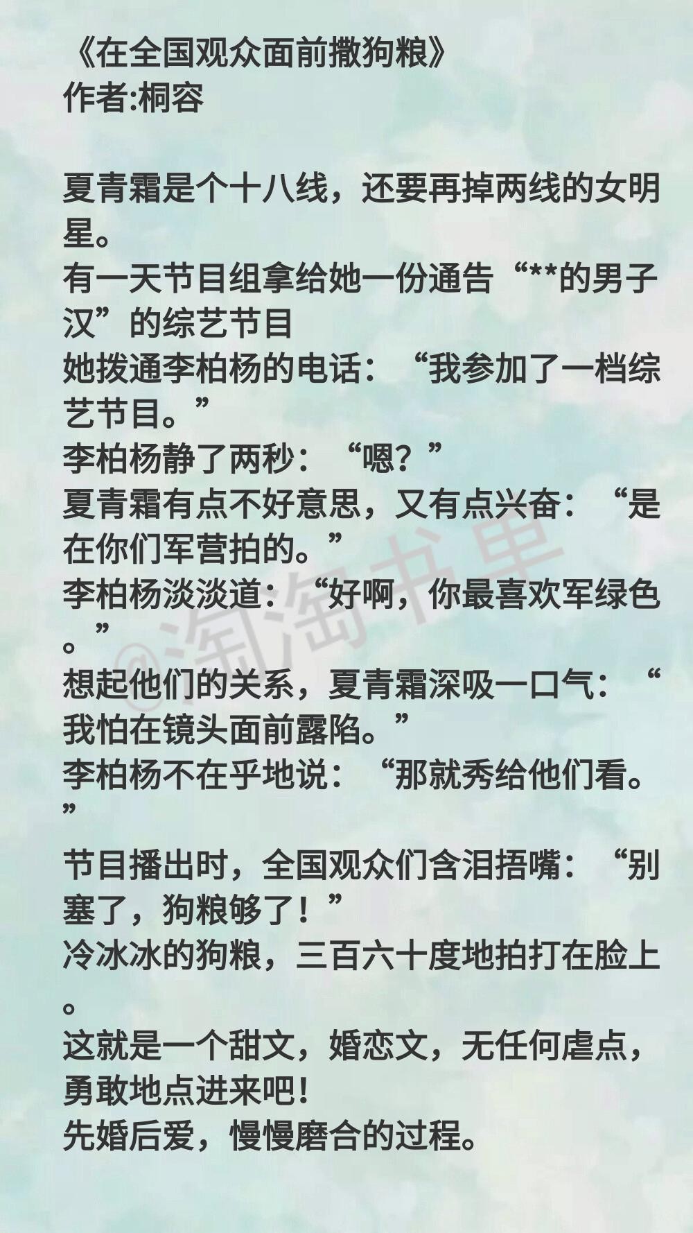 女主是十八钱小明星,男主是军人,两个人通过相亲认识的,但两家人是知根知底的那种,女主见男主第一面就喜欢上他了,后来两个人结婚。文开头两人就已经结婚了。后来,女主要去男主军营拍综艺,一个不小心就成了撒狗粮!