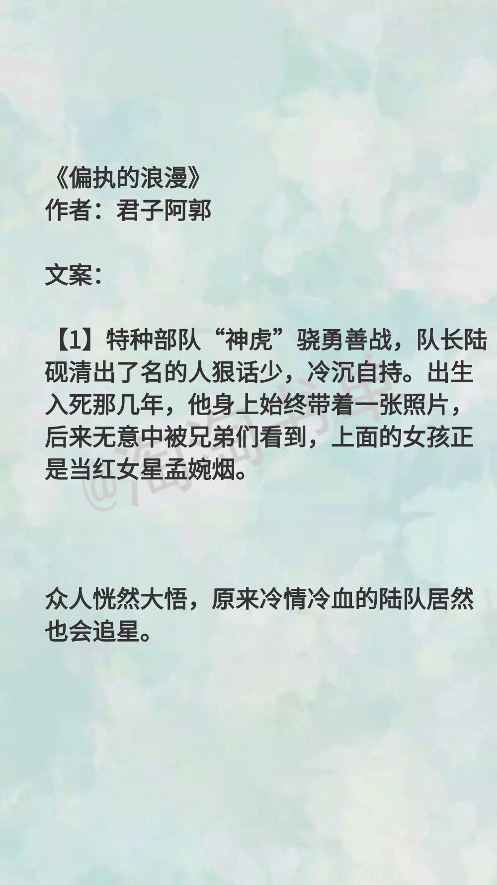 男主是军人,女主是演员,有虐点,但是还好。两个人都很专一,有涉及网络暴力,甜文,总体还是中规中矩 。