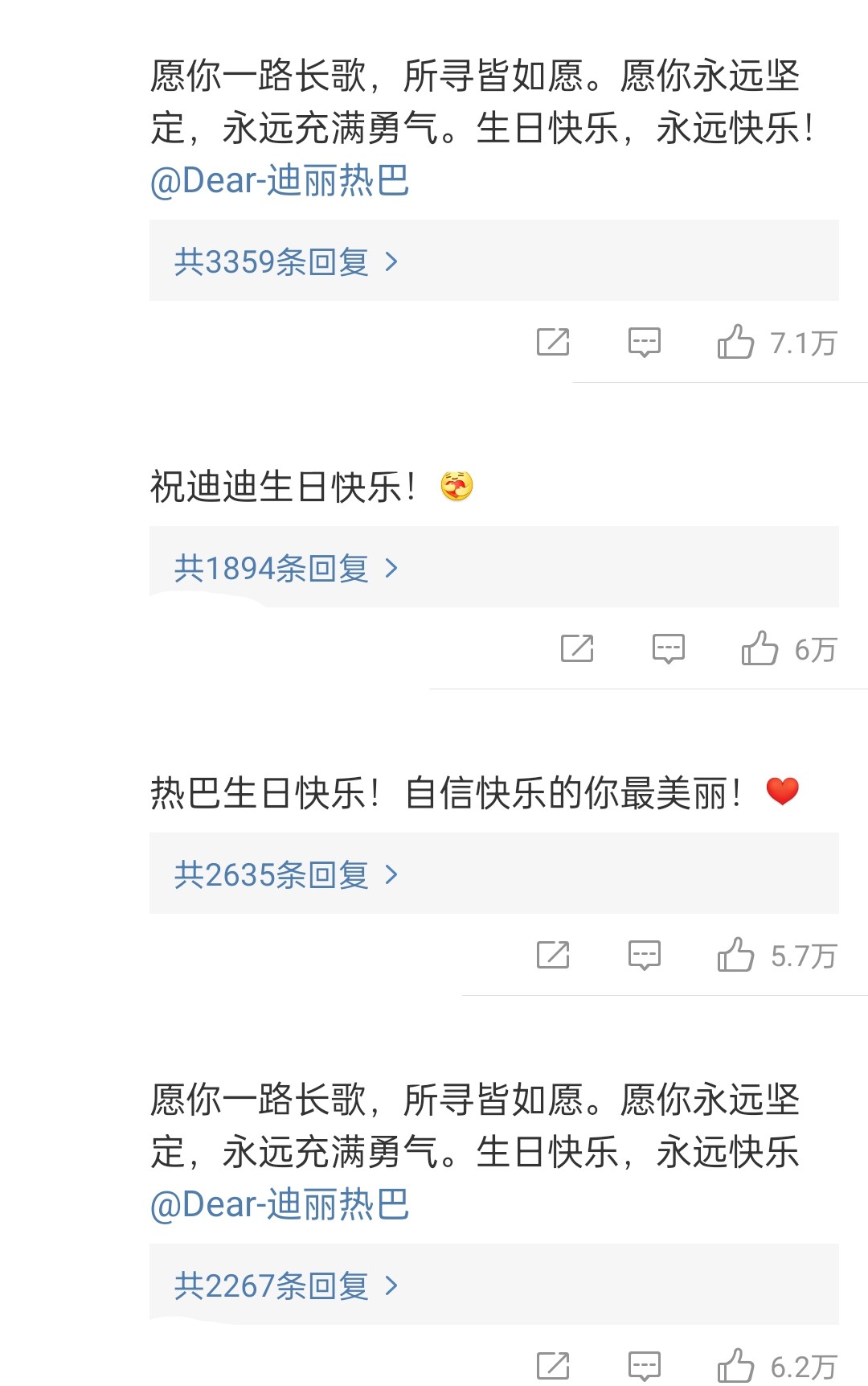 直到随着时间慢慢过去,迪丽热巴的老板兼闺蜜杨幂才姗姗来迟在微博评论区留下了祝福发言,除此之外,零星的偶像也冒出了头,且时间都处于生日下午。对比那些卡点祝福、专博祝福,这些虽不能说简单,但确实没什么隆重感。