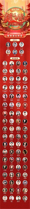虽然明星阵容相对较为低调,但这并不妨碍湖北卫视春晚在多个领域汇聚了60多组明星,包括歌手、演员、相声演员和流行乐队等。一线明星如萧敬腾、腾格尔、任贤齐、何晟铭、袁姗姗等为春晚增色不少。