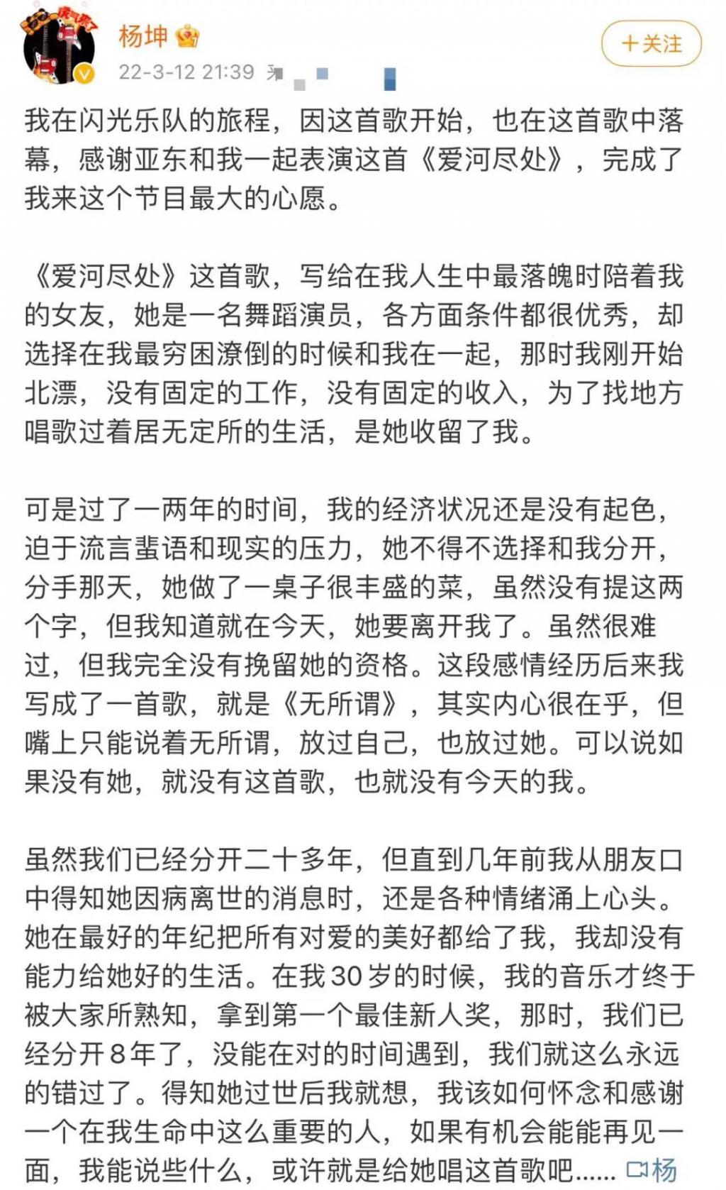 后来,两人因为矛盾分手,十几年后白雪又因病去世,而杨坤对其依旧念念不忘,甚至在去年写了一首歌《爱河尽处》来怀念白雪。