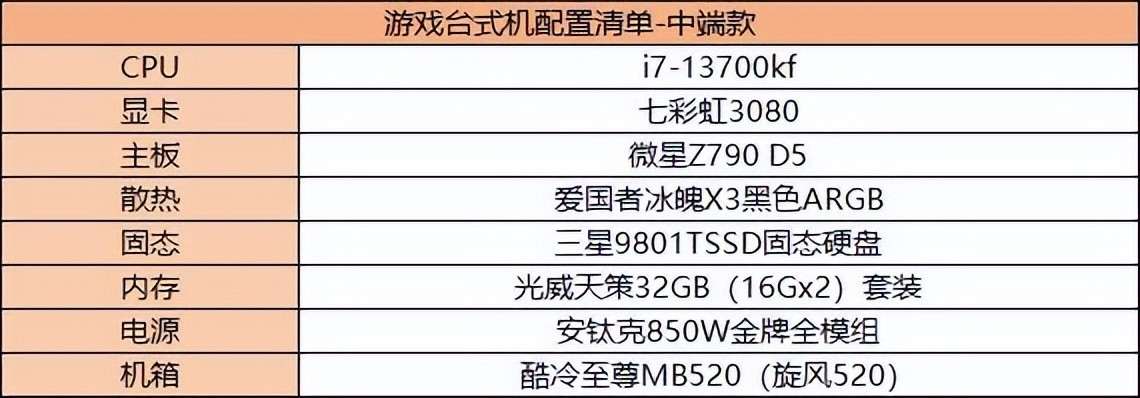 确定显卡留足预算后,再来考虑CPU,可以从intel 12代i5开始选,预算有限的话,可以选择i5-12490F,预算充足,可以选12代i7、i9或者是13代的酷睿产品。如果说12代处理器相比于11代是大跨步的前进,那么13代酷睿相比于12代,更像是精雕细琢的进步,13代酷睿延续了12代核心异构的特性,13代i9级最高达到了24核心36线程,13代i7 13700K达到了16核心24线程,相比于12代处理器在核心数和线程数上均有所增加,而这些变化带来最明显的改变就是性能上的提升,单核提升15%,多核提升41%,能效增幅更是高达300%之多。以下按这个思路推荐3款不同价位的游戏主机配置清单。