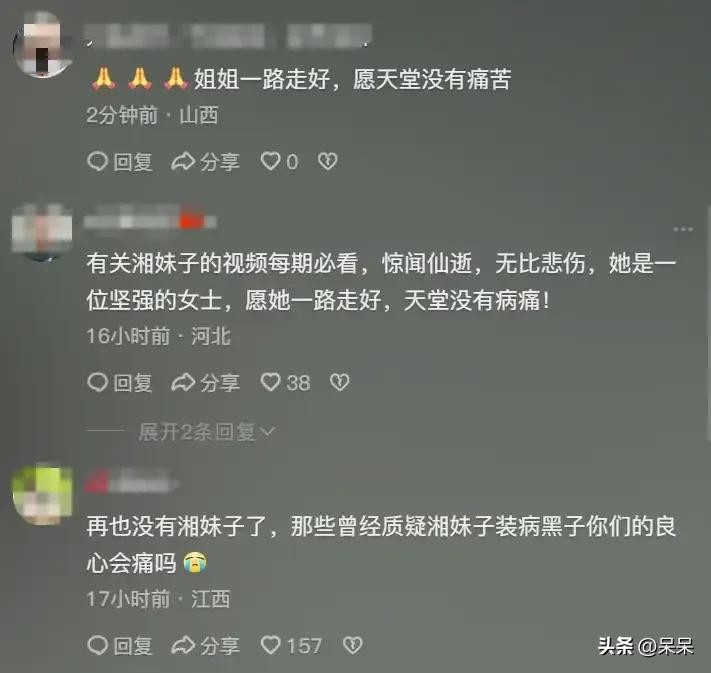 今天,我们怀念湘妹子,感谢她曾带给我们的感动与启发。愿她在天堂安息,也希望每一个人都能在她的故事中找到力量,继续勇敢地走下去。