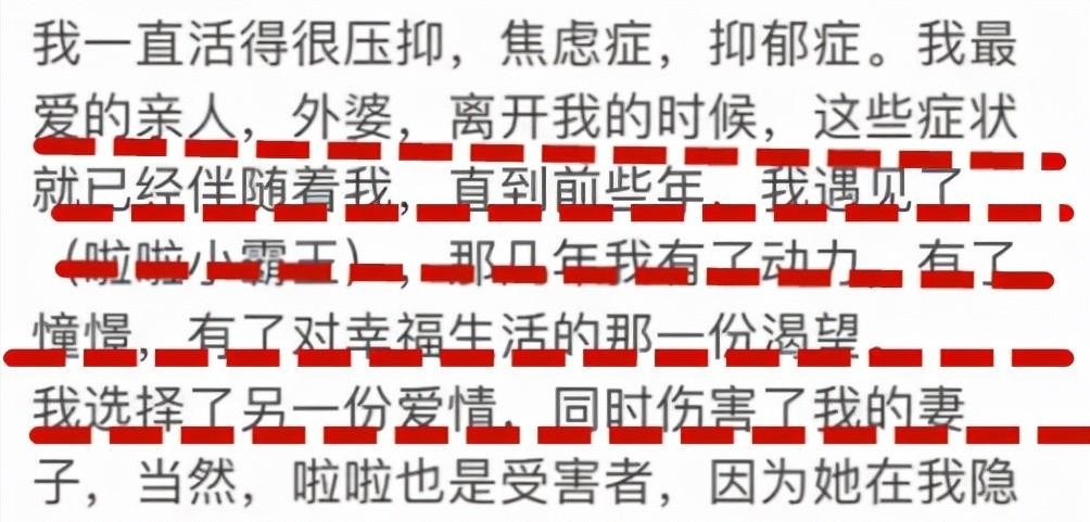 他个人表示,无论是妻子,还是啦啦,都是受害者。啦啦并不知道他已经结婚生子了,与他一起度过了几年,对于妻子,他满心愧疚,因为他婚内出轨了。