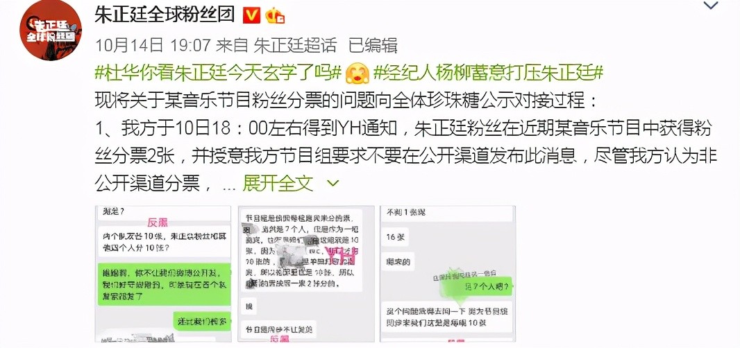 除此之外,还有粉丝表示朱正廷没有个人打歌舞台。在某张聊天记录中,有粉丝质问乐华的工作人员为什么朱正廷没有单独表演,而工作人员则表示“这是个打歌节目”。在此之后粉丝还表示这就是乐华的节目,并且质问工作人员为什么安排不了。而乐华的工作人员则直言自己只能按照节目组传达的内容给到大家。