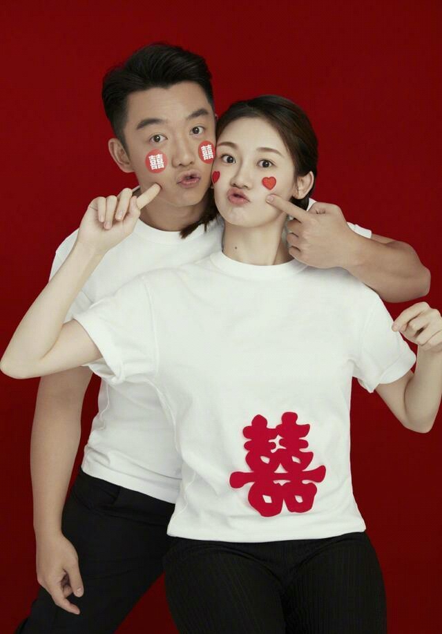 照片中郑恺与苗苗都穿着一身有“2020.5.21”字样的情侣衬衫,脸上贴着红色爱心或者“囍”字贴纸,手上拿着结婚证,对着镜头摆出各种姿势,非常可爱。