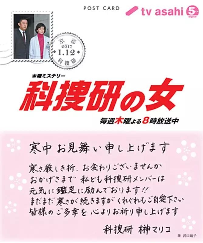 泽口靖子以代表作《科搜研之女》系列中的角色写下的严寒问候信。信中的字既漂亮又清晰易懂,从中能感受到和她外表一样优秀的内在品质。