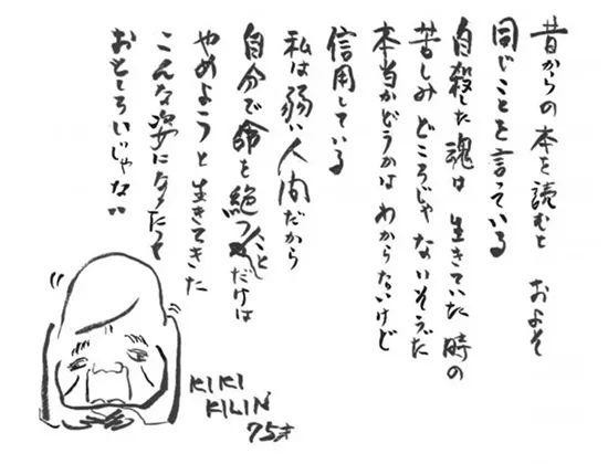 树木希林生前曾展示过多次她极其漂亮的字。一旁还画的自肖像也很出色,很好地还原了其本人的特点。