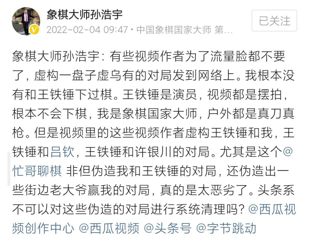 孙浩宇大师也是在网上实锤了王铁锤不会下棋,都是摆拍,但是他更加批评了那些蹭王铁锤热度,挂羊头,卖狗肉,发布子虚乌有对局的短视频博主;象棋第一人王天一也是在某次直播中暗指王铁锤为摆拍 。