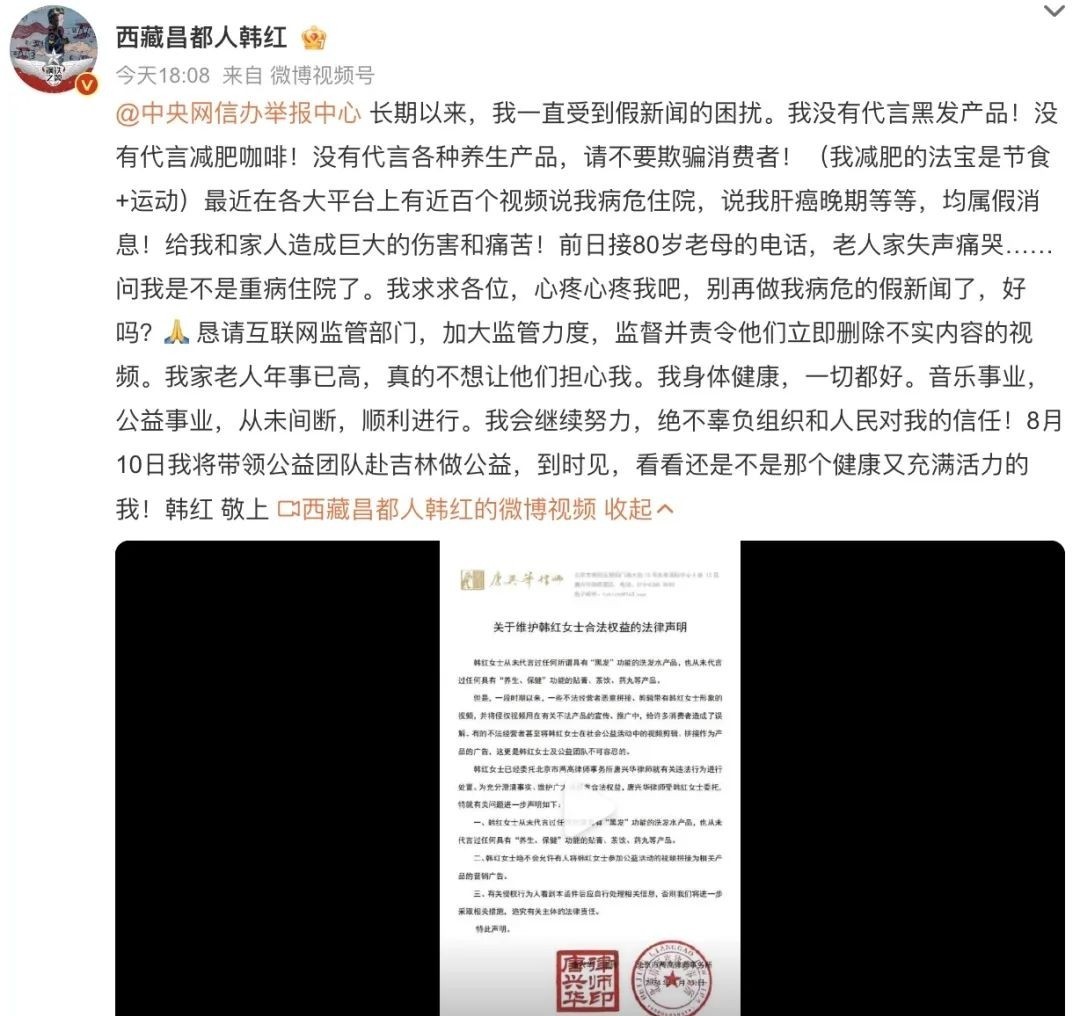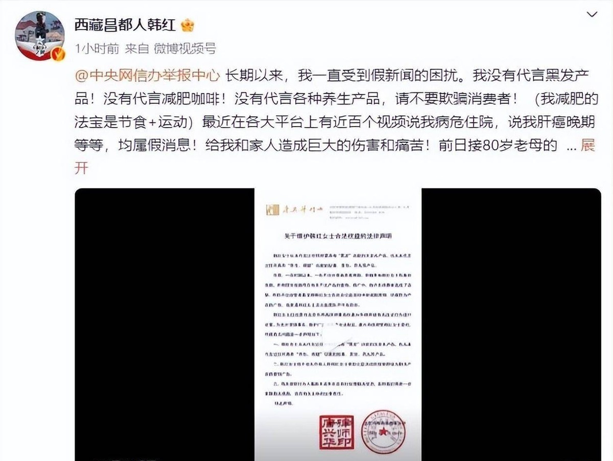 面对这突如其来的谣言,韩红并没有选择沉默,而是通过社交媒体发表了一篇长文,对这些不实的谣言进行了有力的辟谣。她明确表示,自己的健康状况良好,并无患病,更没有所谓的晚期肝癌。这一举动,不仅及时遏制了谣言的进一步扩散,也为广大关心她的网友带来了一丝安慰。
