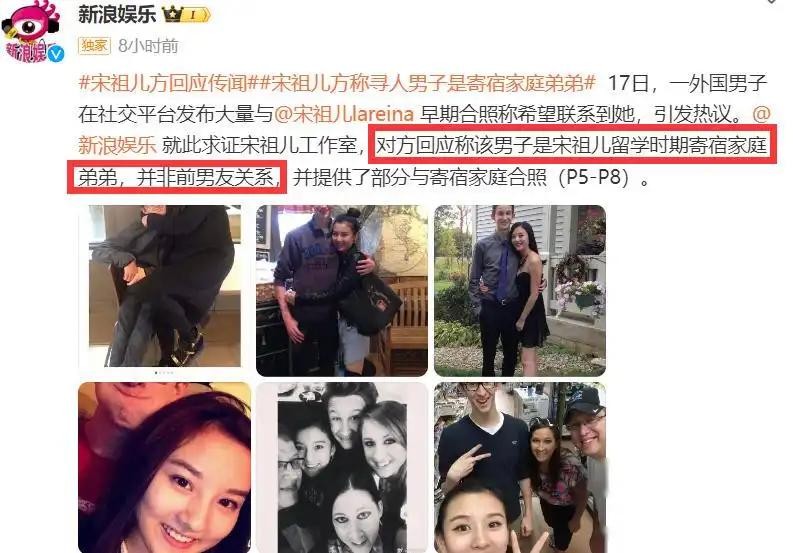 而此次事件再一次出现,宋祖儿工作室对该事件进行了澄清,并且表示该白人男性是她留学时期寄宿家庭的弟弟,并不是前男友。