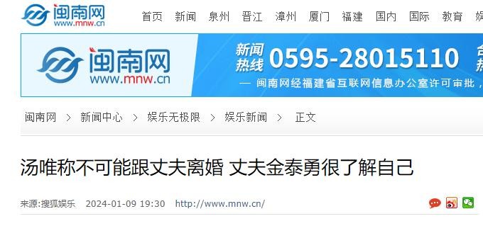 闽南网:汤唯称不可能跟丈夫离婚 丈夫金泰勇很了解自己