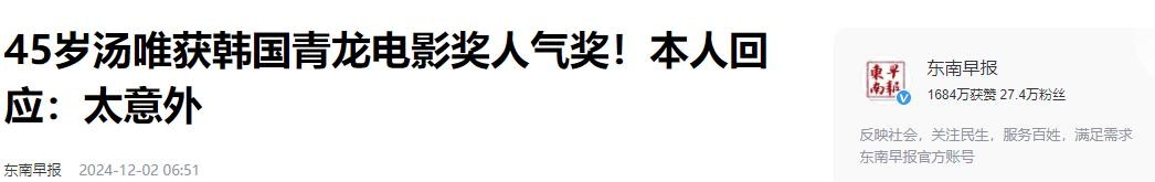 东南早报:45岁汤唯获韩国青龙电影奖人气奖!本人回应:太意外