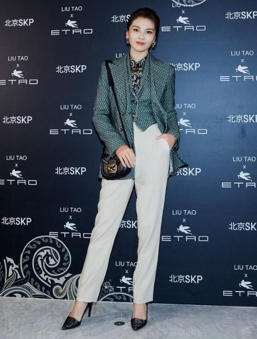 在另一场公开活动中,刘涛选择了绿色不规则西装马甲搭配绿色不规则印花西装,展现了春日的清新感。