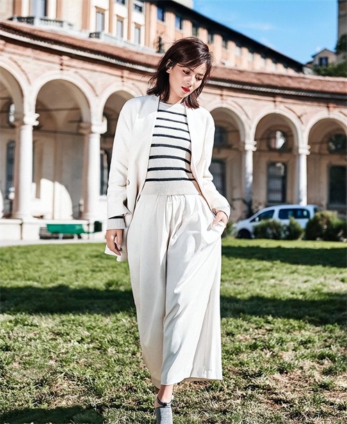 在另一场合,刘涛选择了杏色条纹拼色针织衫搭配白色不规则西装,为职场穿搭带来了新的可能性。白色高腰休闲阔腿裤不仅舒适,同时也打破了传统职业装的束缚。她的短碎发为整体造型增添了一丝俏皮与时尚感,彰显了她在穿搭中的个性品味。
