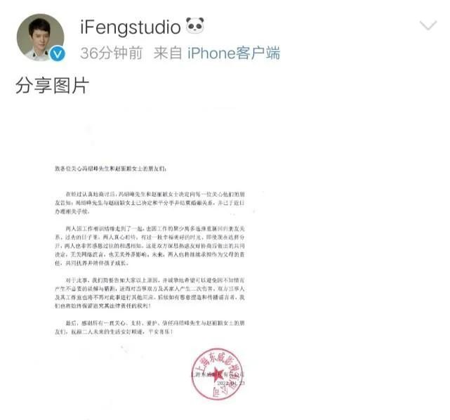 但是这段感情仅仅维持了两年,就按照人们猜测的结局来了,两人离婚了,2021年4月23日,冯绍峰与赵丽颖分别发出声明,两人已和平分手并结束婚姻关系。