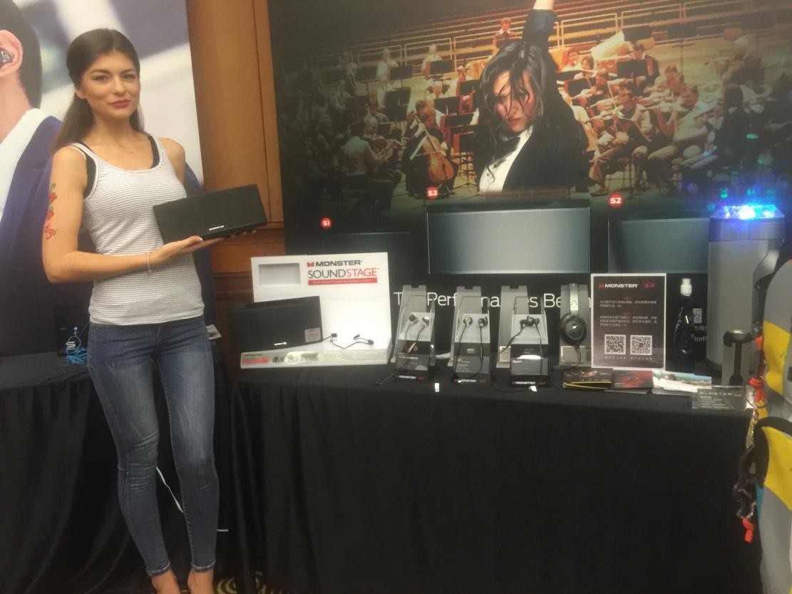 魔声在本次活动中展出了许多新品,包括有Monster ClarityHD、Elements 头戴式无线耳机、与游戏大玩家Johnathan “Fatal1ty” Wendel合作的首款游戏耳机FXM100和FXM200、iSport 系列运动耳机、超便携无线音箱SuperStar Blaster以及备受期待的SoundStage® 皇家剧院无线音响。陪伴在这些新品旁边的是一位美丽的外国友人。
