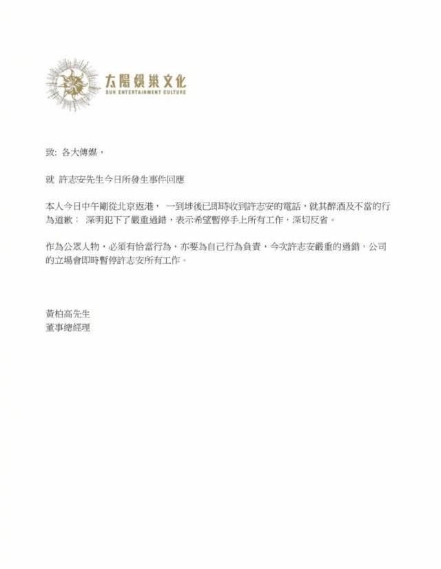 许志安在新闻发布会上道歉后,该公司发表声明,宣布立即暂停许志安的所有工作。值得注意的是,停摆并不意味着娱乐业的终结,许志安未来可能会重返工作岗位。
